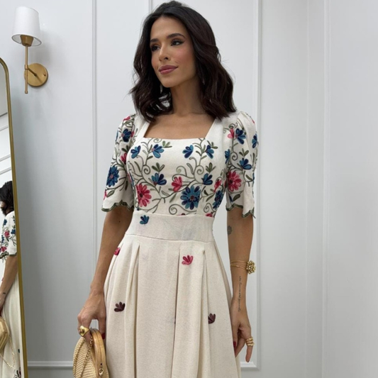 Vestido de Linho Bordado Borboletas Sophie Rosa