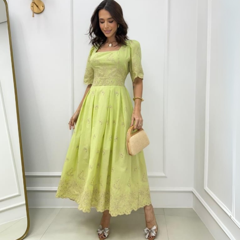Use com sandálias de salto fino, rasteirinhas delicadas ou alpargatas para um visual romântico e versátil. Complete com uma clutch estruturada ou bolsa de palha sofisticada e aposte em acessórios dourados sutis, criando combinações perfeitas para casamentos ao ar livre, almoços especiais ou passeios elegantes, sempre com charme e sofisticação.