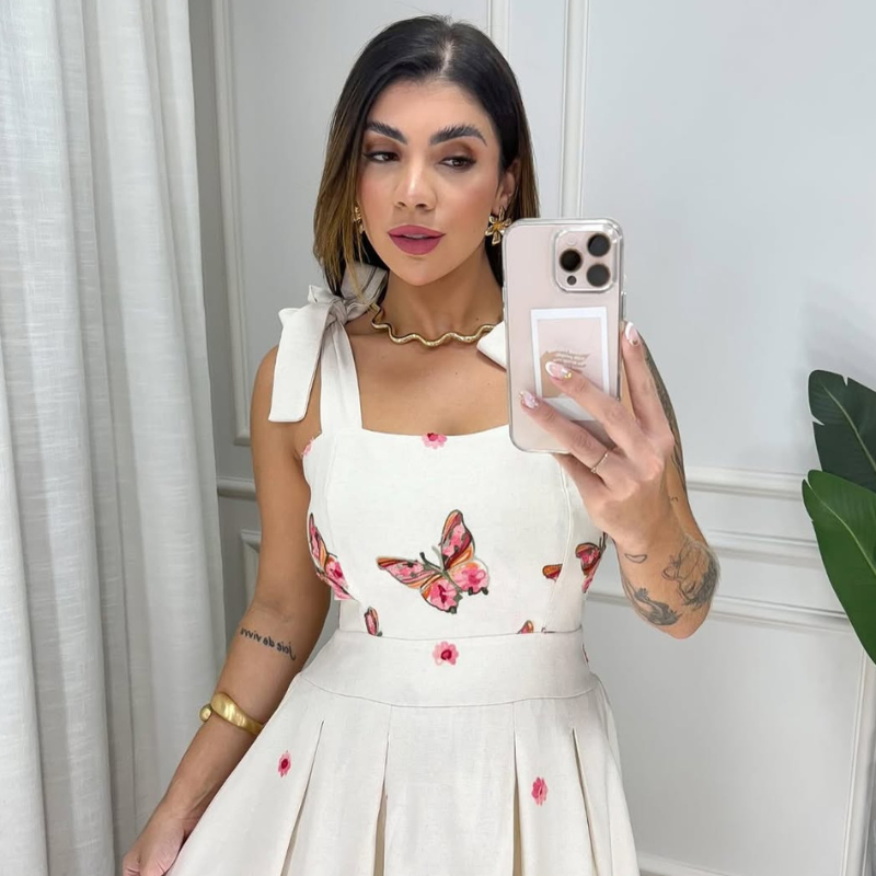 Vestido de Linho Bordado Borboletas Sophie Rosa