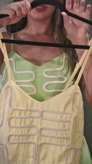 Sua modelagem evasê valoriza a silhueta com a cintura bem marcada graças ao lastex nas costas, enquanto a saia traz fluidez e movimento. O bordado em corda no busto adiciona um toque autêntico e especial. As alças finas e reguláveis permitem melhor ajuste, e o bojo estruturado garante segurança e charme ao vestir, inclusive sem sutiã.